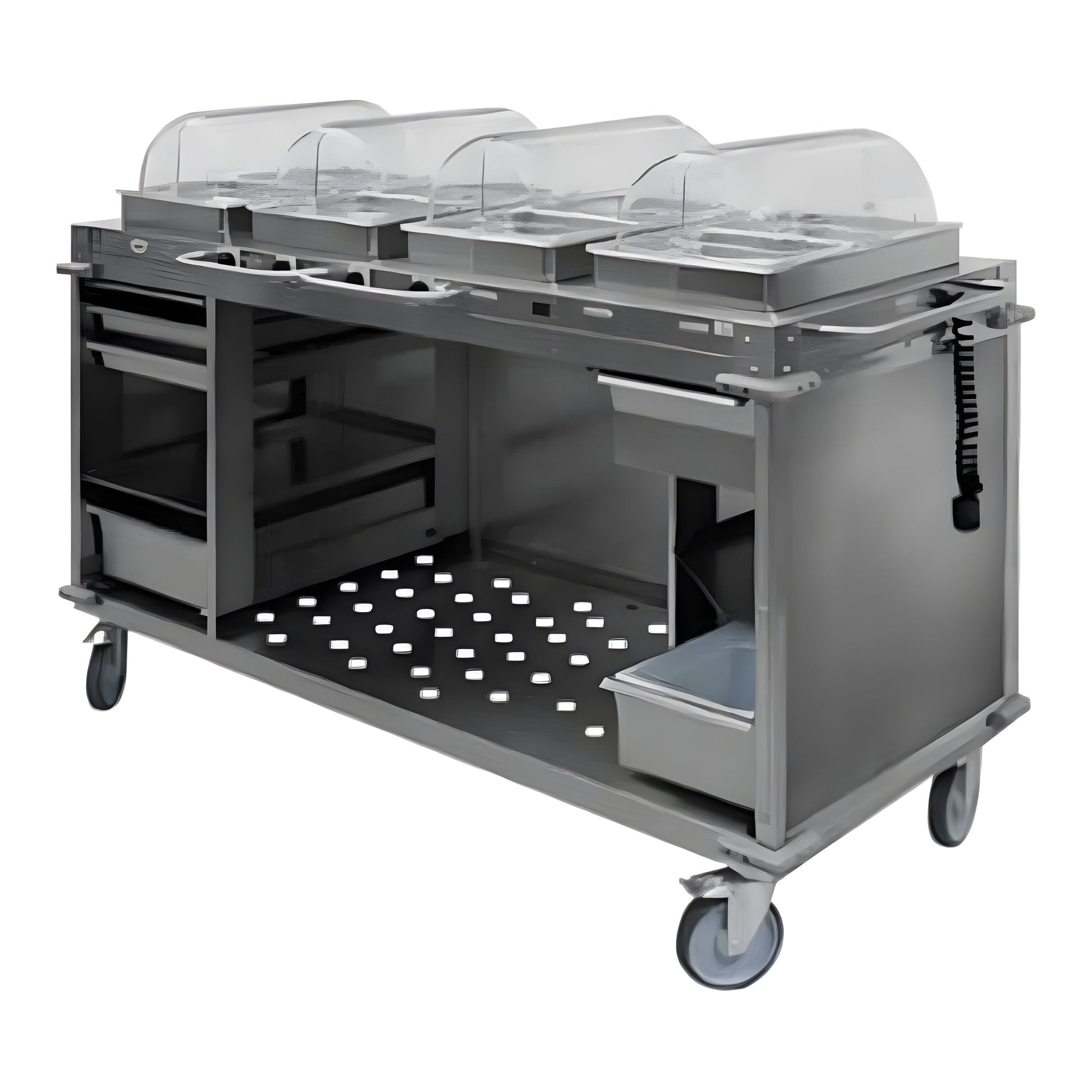 The Cadco MobileServ 70 1/4" x 31 1/2" Mobile Food Cart with 4 heated wells is a versatile and robust solution for catering, buffet services, or food transport in any commercial setting. Designed with mobility in mind, this cart is constructed from high-quality stainless steel, ensuring durability and resistance to wear. It features four heated wells to keep food at the perfect serving temperature, with a total wattage of 1,200 watts, making it energy-efficient for extended use. The cart includes eight pans for food storage, along with six drawers and two shelves for ample storage and organization. With its heavy-duty casters, including brakes for stability, this mobile food cart is easy to maneuver while ensuring safety during operation.